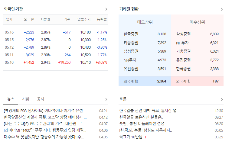 물론 제일 좋은 경우는 기관과 외국인 모두 매수하는 쌍끌이 종목을 공략하는 것입니다. 양대 매수주체들이 동시에 매수한다는 뜻은 그만큼 좋은 종목인 것을 의미합니다. 주식의 흐름을 분석하기 위해서는 먼저 기업체를 분석하고 시장 흐름에서의 위치를 확인해야 합니다. 그리고 기관과 외국인 매수 흐름을 확인한다면 수익이 올라갈 확률을 올릴 수 있다고 생각합니다.