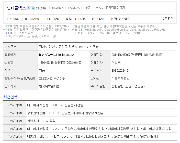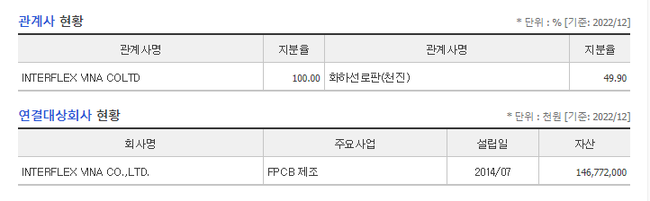 -동사는 1994년 설립되어 2003년 코스닥시장에 상장된 연성인쇄회로기판(FPCB) 제조업체임. 베트남에 위치한 INTERFLEX VINA CO.,LTD를 연결대상 종속회사로 보유함. 삼성전자, 삼성디스플레이 등이 주요 고객사임. 영풍전자, 비에이치 등이 주요 경쟁사임. 현지 고객 요구에 따라 중국 및 베트남 출자회사에 CAPA 증설 투자를 진행하는 등 시장 수요에 적극 대응하고 있음.