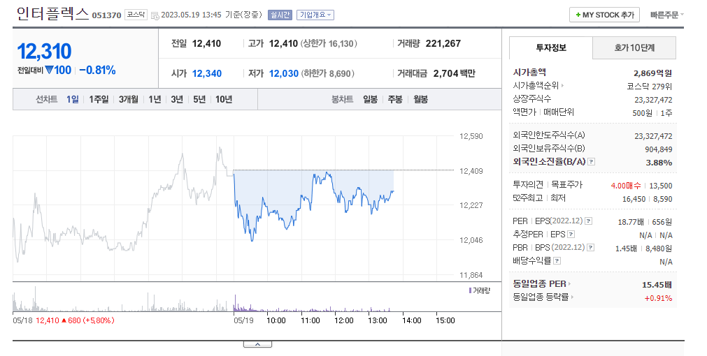 이 글에서는 인터플렉스 주가 전망과 목표 주가, 기업 정보에 대해서 설명합니다. 주식 투자에 앞서 정확한 기업 정보와 주가 현황에 대해 분석하는 것이 필요합니다. 인터플렉스 주식의 주요 현황과 투자 정보를 확인하시고 지금 시장 흐름을 살펴보겠습니다.