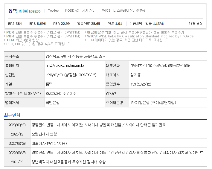 톱텍는 디스플레이 및 관련부품 기업입니다. 대표자는 정지용 이며 설립일은 1996/06/20, 주식 상장일은 2009/09/15입니다. 전체 종업원 수는439명 이고 본사 주소는 경상북도 구미시 산동읍 5공단4로 28 -입니다.
