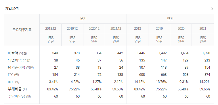-2022년 동사 연결기준 매출액은 2042.9억원으로 전년 동기 대비 약 20% 증가함. 영업이익은 246.8억원으로 전년 동기 대비 증가했으며 당기순이익은 181.2억원으로 전년 동기 대비 수익성 개선됨. 웰빙문화의 확산으로 인해 유기농관련제품의 인식이 높아져 각종 유기농 농축액 제품들의 매출액이 증가하고 있는 추세임. 동사는 수익성 확보를 위해 식품 첨가물 활용에 대한 연구개발에 지속적인 투자를 진행하고 있음.