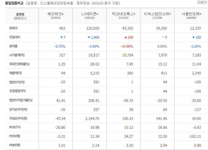 -2023년 3월 전년동기 대비 연결기준 매출액은 37.8% 감소, 영업손실은 45.8% 증가, 당기순손실은 44.5% 증가. 디스플레이 기기업체의 부품 협력 업체로 직접 거래를 통한 공급을 하고 있으며, 본사의 경우 한국에서 개발된 솔루션을 자회사로 상품 혹은 제품의 형태로 공급을 병행함. 다른 경쟁사에 비해 고객 기기에 필요한 물성을 구현한 솔루션을 공급하는 것을 기본 전략으로 삼아 운영중임.