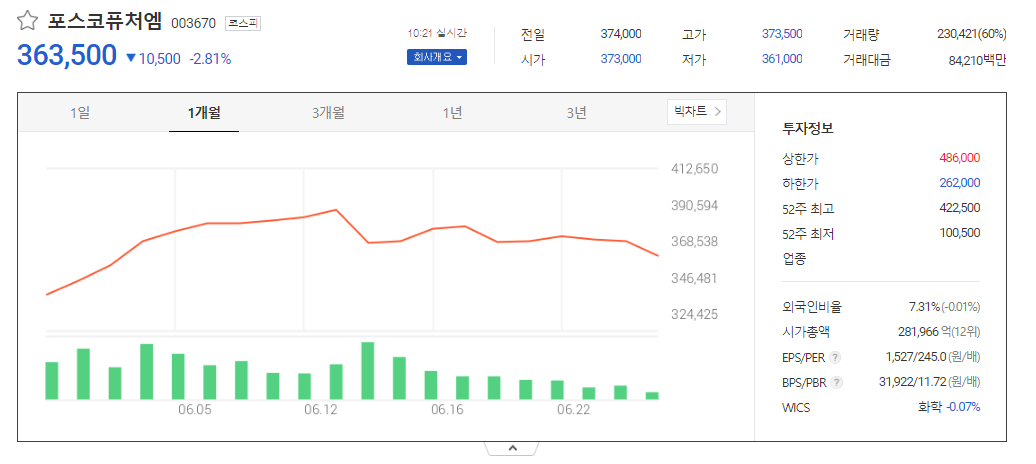 이 글에서는 포스코퓨처엠 주가 전망과 목표 주가, 기업 정보에 대해서 설명합니다. 주식 투자 전에 기업 주가와 재무 현황표에 대해서 알아보는 것은 아주 중요합니다. 포스코퓨처엠 주식의 주요 현황과 투자 정보를 확인하시고 지금 시장에서 위치를 파악해보겠습니다.