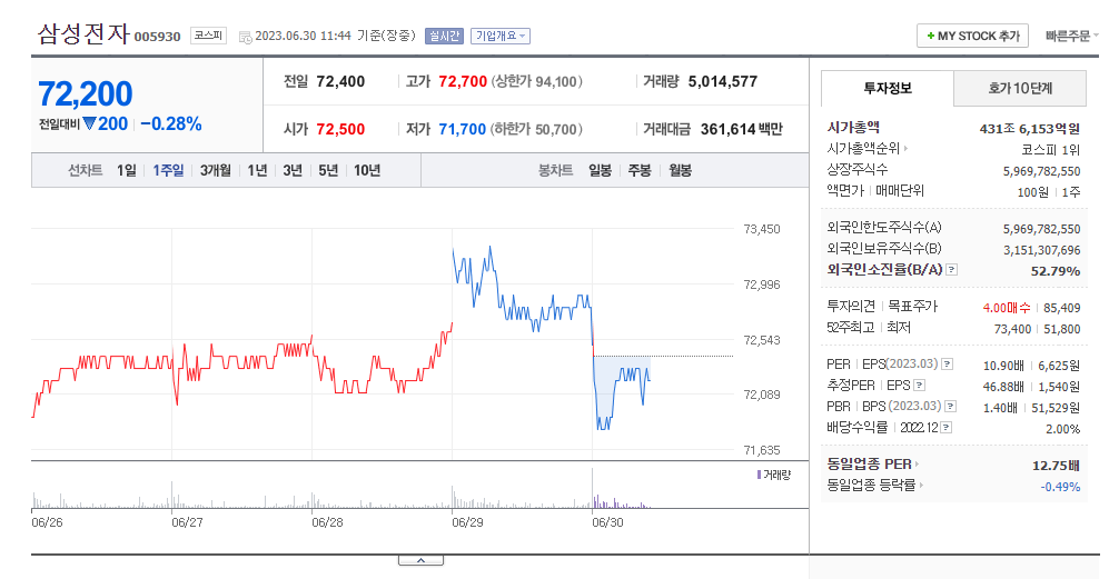 삼성전자 현재 주가는 72,400원이며 전일 대비 -300원의 모습을 보이고 있습니다. 삼성전자의 주주현황을 살펴보면 삼성생명보험(외 15인)이 지분 20.73%를 소유하고 있습니다. 삼성전자는 반도체 및 관련장비 기업으로 장중 기준으로 주가는 72,400원 입니다. 삼성전자의 시가 총액은 431조183억 원이며 발행 주식수는 52.79주 입니다. 외국인 보유 비중은 12,229,967% 이며 장중 거래량은 5,969,782,550를 기록했습니다. 매출액은 637,454억 원, 영업이익은 433,766억 원을 달성했습니다. EPS는 1,549원이며 삼성전자 주식 배당수익률은 2.61% 입니다.