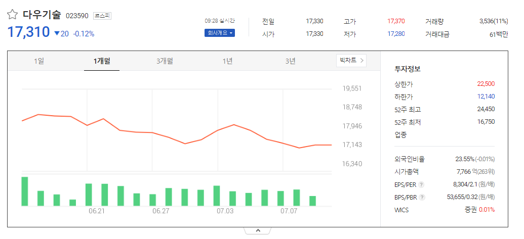 다우기술 현재 주가는 17,330원이며 전일 대비 -6.83원의 모습을 보이고 있습니다. 다우기술의 주주현황을 살펴보면 다우데이타(외 9인)이 지분 47.43%를 소유하고 있습니다. 다우기술는 증권 기업으로 장중 기준으로 주가는 17,330원 입니다. 시가 총액은 7775억 원이며 발행 주식수는 23.55주 입니다. 외국인 보유 비중은 29,940% 이며 장중 거래량은 44,866,617를 기록했습니다. 매출액은 31,507억 원, 영업이익은 7,187억 원을 달성했습니다. 다우기술 주식 배당수익률은 3.13% 입니다.