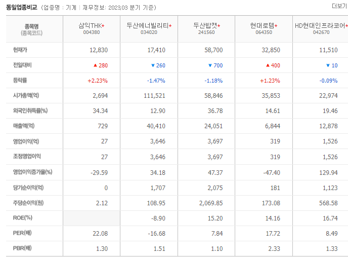 -2023년 3월 전년동기 대비 연결기준 매출액은 2.1% 감소, 영업이익은 38.8% 감소, 당기순이익은 98.9% 감소. 서브모터, 감속기, 스카라 로봇, LCD이송로봇(LTR) 등의 메카트로시스템 부분 매출이 4.8% 소폭 증가했지만 LM시스템 부분의 매출이 10.6% 줄어들면서 전체 매출액이 소폭 감소함. LM가이드제품은 자동화부품 시장에서 50% 점유율을 차지하고 있으나, 과거보단 치열한 경쟁이 벌어지고 있는 상황임.
