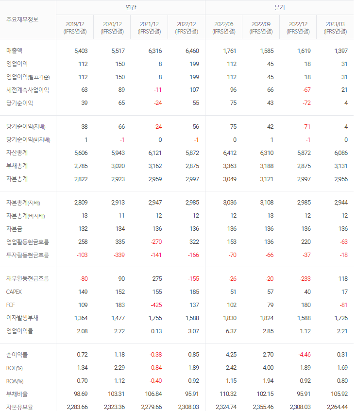 -2023년 3월 전년동기 대비 연결기준 매출액은 6.6% 감소, 영업이익은 34% 증가, 당기순이익은 59.6% 감소. 매출 감소에도 불구하고 원가절감 노력에 힘입어 영업이익은 증가하였으나 이자비용 및 법인세비용으로 당기순이익은 감소함. 옥수수 폐기물에서 추출하여 생물자원을 사용한 바이오매스 기반의 친환경 인테리어 페인트가 미국 농무부 친환경 인증을 받는 등 바이오 소재 기반 제품 개발에도 매진하고 있음.
