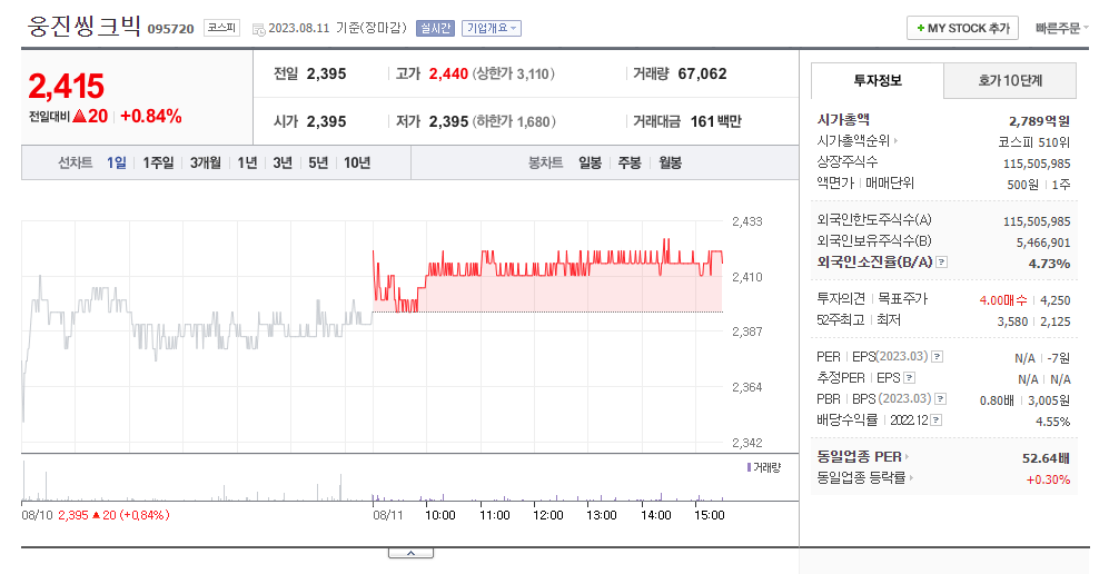 이 글에서는 웅진씽크빅 주가 전망과 목표 주가, 기업 정보에 대해서 설명합니다. 주식을 제대로 하기에 앞서 기업의 주가와 재무 정보에 대해서 분석하는 것이 필요합니다. 웅진씽크빅 주식의 주요 현황과 투자 정보를 확인하시고 지금 시장에서 위치를 파악해보겠습니다.