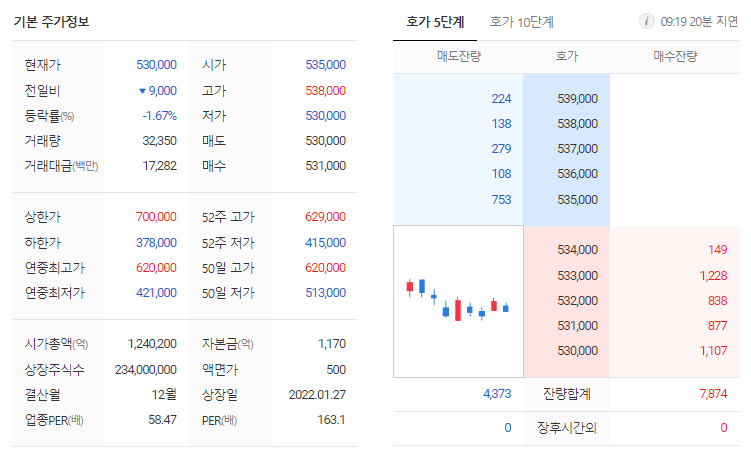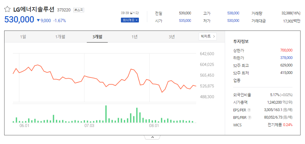 LG에너지솔루션 현재 주가는 539,000원이며 전일 대비 -5.27원의 모습을 보이고 있습니다. LG에너지솔루션의 주주현황을 살펴보면 LG화학(외 1인)이 지분 81.84%를 소유하고 있습니다. LG에너지솔루션는 전자 장비 및 기기 기업으로 장중 기준으로 주가는 539,000원 입니다. 삼성전자의 시가 총액은 125조1900억 원이며 발행 주식수는 5.17주 입니다. 외국인 보유 비중은 195,045% 이며 장중 거래량은 234,000,000를 기록했습니다. 매출액은 175,206억 원, 영업이익은 12,137억 원을 달성했습니다. EPS는 8,013원입니다.