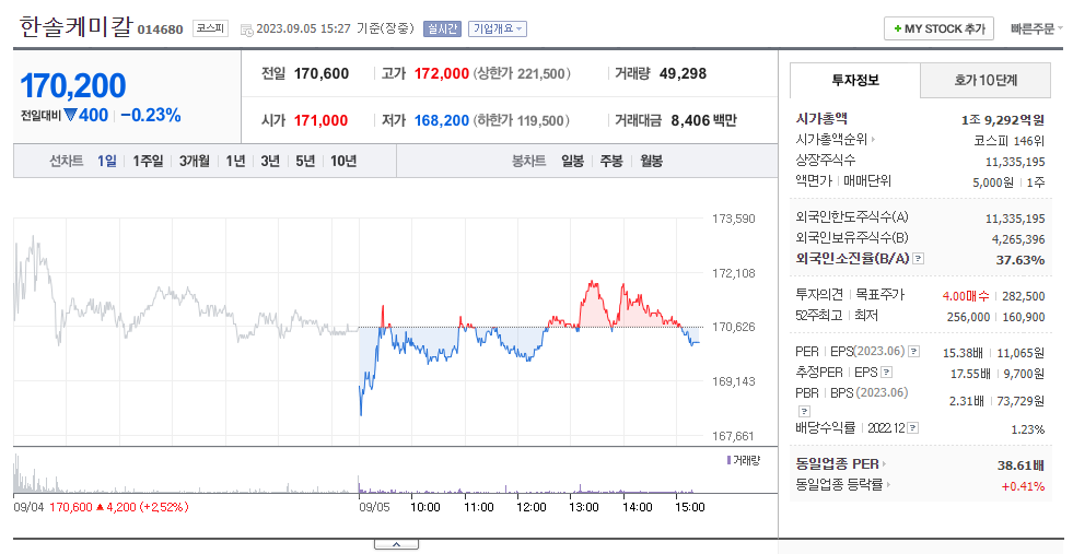 한솔케미칼 현재 주가는 170,600원이며 전일 대비 -11.15원의 모습을 보이고 있습니다. 한솔케미칼의 주주현황을 살펴보면 조동혁(외 11인)이 지분 15.08%를 소유하고 있습니다. 한솔케미칼는 화학 기업으로 장중 기준으로 주가는 170,600원 입니다. 삼성전자의 시가 총액은 1조9292억 원이며 발행 주식수는 37.63주 입니다. 외국인 보유 비중은 130,162% 이며 장중 거래량은 11,335,195를 기록했습니다. 매출액은 3,919억 원, 영업이익은 1,860억 원을 달성했습니다. EPS는 9,700원이며 한솔케미칼 주식 배당수익률은 1.13% 입니다.