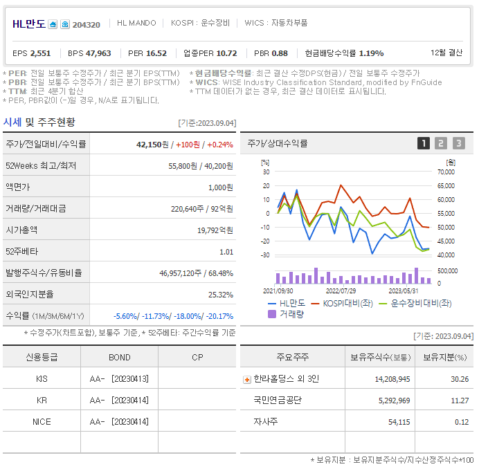 HL만도 현재 주가는 42,150원이며 전일 대비 -5.60원의 모습을 보이고 있습니다. HL만도의 주주현황을 살펴보면 한라홀딩스(외 3인)이 지분 30.26%를 소유하고 있습니다. HL만도는 자동차부품 기업으로 장중 기준으로 주가는 42,150원 입니다. 삼성전자의 시가 총액은 1조9558억 원이며 발행 주식수는 25.32주 입니다. 외국인 보유 비중은 220,640% 이며 장중 거래량은 46,957,120를 기록했습니다. 매출액은 40,835억 원, 영업이익은 2,481억 원을 달성했습니다. EPS는 4,725원이며 HL만도 주식 배당수익률은 1.24% 입니다.