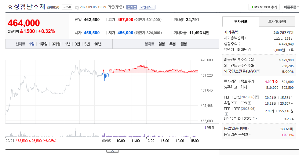 효성첨단소재 현재 주가는 462,500원이며 전일 대비 원의 모습을 보이고 있습니다. 효성첨단소재의 주주현황을 살펴보면 효성(외 12인)이 지분 44.69%를 소유하고 있습니다. 효성첨단소재는 화학 기업으로 장중 기준으로 주가는 462,500원 입니다. 삼성전자의 시가 총액은 2조787억 원이며 발행 주식수는 5.99주 입니다. 외국인 보유 비중은 51,412% 이며 장중 거래량은 4,479,948를 기록했습니다. 매출액은 16,509억 원, 영업이익은 3,151억 원을 달성했습니다. EPS는 25,507원이며 효성첨단소재 주식 배당수익률은 4.50% 입니다.