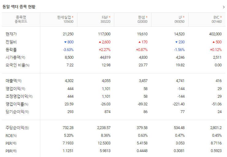 한세실업 현재 주가는 22,050원이며 전일 대비 원의 모습을 보이고 있습니다. 한세실업의 주주현황을 살펴보면 한세예스24홀딩스(외 9인)이 지분 64.68%를 소유하고 있습니다. 한세실업는 섬유 및 의복 기업으로 장중 기준으로 주가는 22,050원 입니다. 시가 총액은 8500억 원이며 발행 주식수는 7.38주 입니다. 외국인 보유 비중은 257,348% 이며 장중 거래량은 40,000,000를 기록했습니다. 매출액은 8,410억 원, 영업이익은 1,796억 원을 달성했습니다. EPS는 2,710원이며 한세실업 주식 배당수익률은 1.07% 입니다.