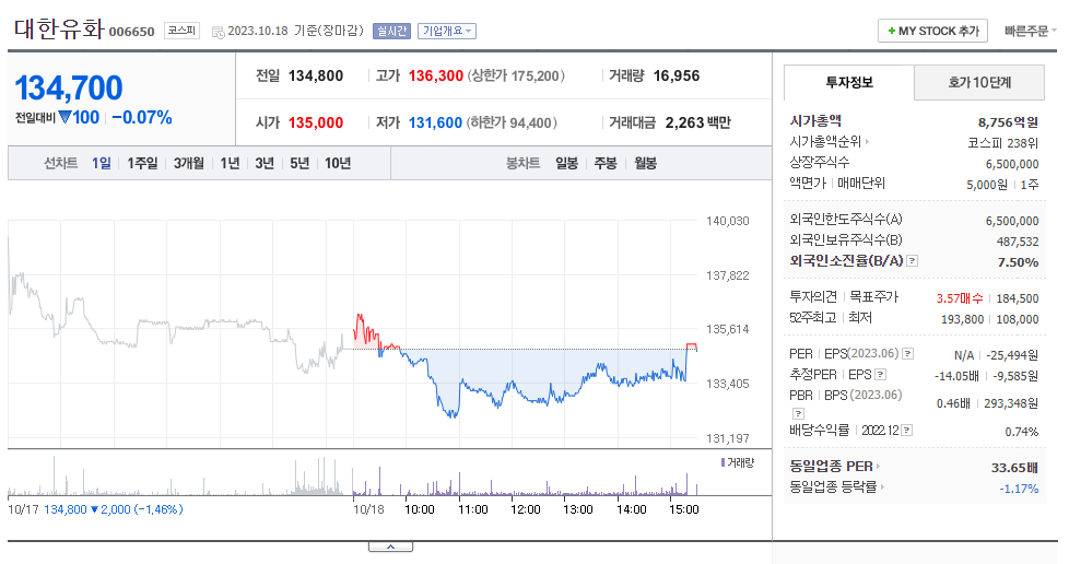 대한유화 현재 주가는 134,800원이며 전일 대비 -2,000원의 모습을 보이고 있습니다. 대한유화의 주주현황을 살펴보면 이순규(외 17인)이 지분 39.24%를 소유하고 있습니다. 대한유화는 화학 기업으로 장중 기준으로 주가는 134,800원 입니다. 시가 총액은 8756억 원이며 발행 주식수는 7.50주 입니다. 외국인 보유 비중은 21,371% 이며 장중 거래량은 6,500,000를 기록했습니다. 매출액은 11,618억 원, 영업이익은 -2,146억 원을 달성했습니다. EPS는 -9,585원이며 대한유화 주식 배당수익률은 0.58% 입니다.