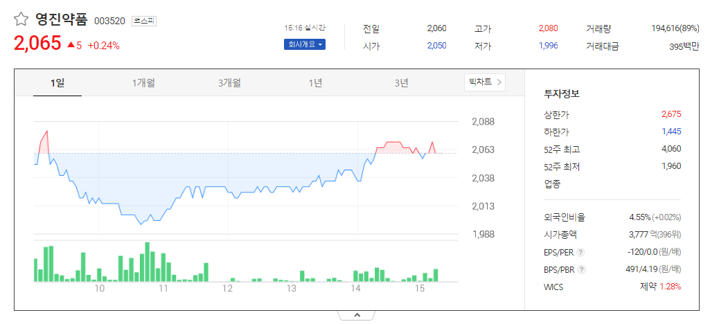 영진약품 현재 주가는 2,060원이며 전일 대비 -12.34원의 모습을 보이고 있습니다. 영진약품의 주주현황을 살펴보면 이 지분 52.45%를 소유하고 있습니다. 영진약품는 제약 기업으로 장중 기준으로 주가는 2,060원 입니다. 영진약품의 시가 총액은 3795억 원이며 발행 주식수는 4.55주 입니다. 외국인 보유 비중은 216,979% 이며 장중 거래량은 182,892,731를 기록했습니다. 매출액은 1,112억 원, 영업이익은 -74억 원을 달성했습니다.영진약품 주식 배당수익률은 5,573.46% 입니다.
