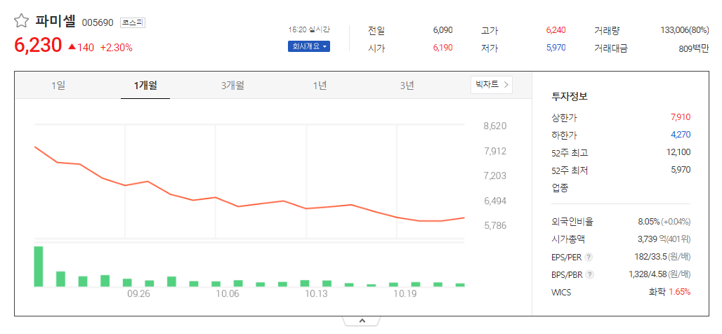 파미셀 현재 주가는 6,090원이며 전일 대비 -21.01원의 모습을 보이고 있습니다. 파미셀의 주주현황을 살펴보면 김현수(외 5인)이 지분 9.33%를 소유하고 있습니다. 파미셀는 바이오 기업으로 장중 기준으로 주가는 6,090원 입니다. 파미셀의 시가 총액은 3745억 원이며 발행 주식수는 8.05주 입니다. 외국인 보유 비중은 164,235% 이며 장중 거래량은 60,016,964를 기록했습니다. 매출액은 308억 원, 영업이익은 89억 원을 달성했습니다.파미셀 주식 배당수익률은 0.85% 입니다.