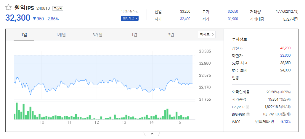 원익IPS 현재 주가는 33,250원이며 전일 대비 -0.60원의 모습을 보이고 있습니다. 원익IPS의 주주현황을 살펴보면 원익홀딩스(외 5인)이 지분 33.05%를 소유하고 있습니다. 원익IPS는 반도체 및 관련장비 기업으로 장중 기준으로 주가는 33,250원 입니다. 원익IPS 시가 총액은 1조5903억 원이며 발행 주식수는 20.26주 입니다. 외국인 보유 비중은 139,676% 이며 장중 거래량은 49,083,901를 기록했습니다. 매출액은 2,850억 원, 영업이익은 976억 원을 달성했습니다. EPS는 316원이며 원익IPS 주식 배당수익률은 0.72% 입니다.