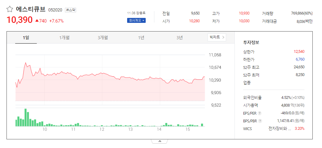 에스티큐브 현재 주가는 9,650원이며 전일 대비 -360원의 모습을 보이고 있습니다. 에스티큐브의 주주현황을 살펴보면 바이오메디칼홀딩스(외 4인)이 지분 5.55%를 소유하고 있습니다. 에스티큐브는 전자 장비 및 기기 기업으로 장중 기준으로 주가는 9,650원 입니다. 에스티큐브 시가 총액은 4808억 원이며 발행 주식수는 4.52주 입니다. 외국인 보유 비중은 1,268,098% 이며 장중 거래량은 46,278,501를 기록했습니다. 매출액은 37억 원, 영업이익은 -189억 원을 달성했습니다. 에스티큐브 주식 배당수익률은 3,812,520% 입니다.