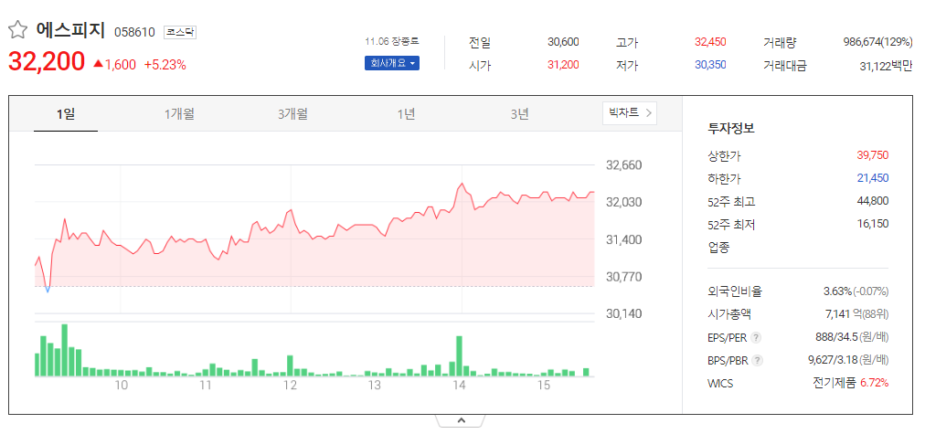 에스피지 현재 주가는 30,600원이며 전일 대비 -25.00원의 모습을 보이고 있습니다. 에스피지의 주주현황을 살펴보면 이준호(외 4인)이 지분 38.89%를 소유하고 있습니다. 에스피지는 전기장비 기업으로 장중 기준으로 주가는 30,600원 입니다. 에스피지 시가 총액은 7141억 원이며 발행 주식수는 3.63주 입니다. 외국인 보유 비중은 760,388% 이며 장중 거래량은 22,177,360를 기록했습니다. 매출액은 1,993억 원, 영업이익은 255억 원을 달성했습니다. EPS는 812원이며 에스피지 주식 배당수익률은 0.72% 입니다.