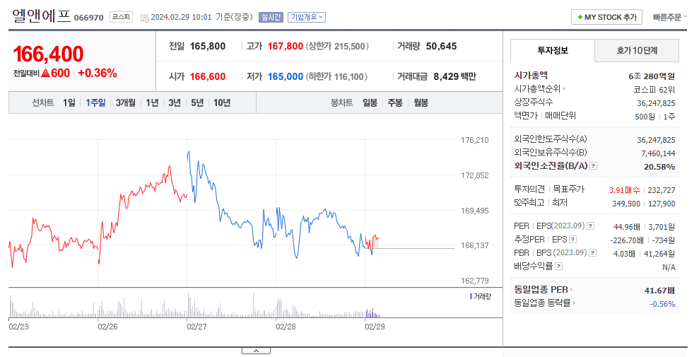 엘앤에프 현재 주가는 165,800원이며 전일 대비 -1,600원의 모습을 보이고 있습니다. 엘앤에프의 주주현황을 살펴보면 새로닉스(외 17인)이 지분 23.74%를 소유하고 있습니다. 엘앤에프는 전자 장비 및 기기 기업으로 장중 기준으로 주가는 165,800원 입니다. 삼성전자의 시가 총액은 6조643억 원이며 발행 주식수는 20.58주 입니다. 외국인 보유 비중은 303,492% 이며 장중 거래량은 36,247,825를 기록했습니다. 매출액은 39,865억 원, 영업이익은 2,663억 원을 달성했습니다. EPS는 -252원이며 엘앤에프 주식 배당수익률은 0.29% 입니다.