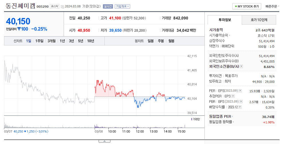 이 글에서는 동진쎄미켐 주가 전망과 목표 주가, 기업 정보에 대해서 설명합니다. 주식 거래에서 주목해야 할 점은 미래의 기업 가치를 예측하고 먼저 움직이는 것입니다. 투자 대상을 선택하기 전에 현재 기업 상황과 지표를 살펴보아야 합니다. 동진쎄미켐 주식의 주요 현황과 투자 정보를 확인하시고 주식 투자에 도움이 될 만한 정보들을 모아 놓았으니 투자 시 참고하시기 바랍니다..
