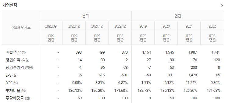 -2023년 9월 전년동기 대비 연결기준 매출액은 0% 증가, 영업이익은 71.2% 감소, 당기순이익 적자전환. 현재 2023년도에는 초기효율이 많이 개선된 실리콘 산화물로 초기효율 85%∼88%의 다양한 제품군으로 양산 준비를 하고 있음. 또한 차세대 실리콘계 음극재로 초기효율(∼90%), 방전용량(≥1800mAh/g)이 획기적으로 개선된 제품을 파일롯 단계에서 고객사들의 평가와 피드백을 받으며 제품화 진행 중.