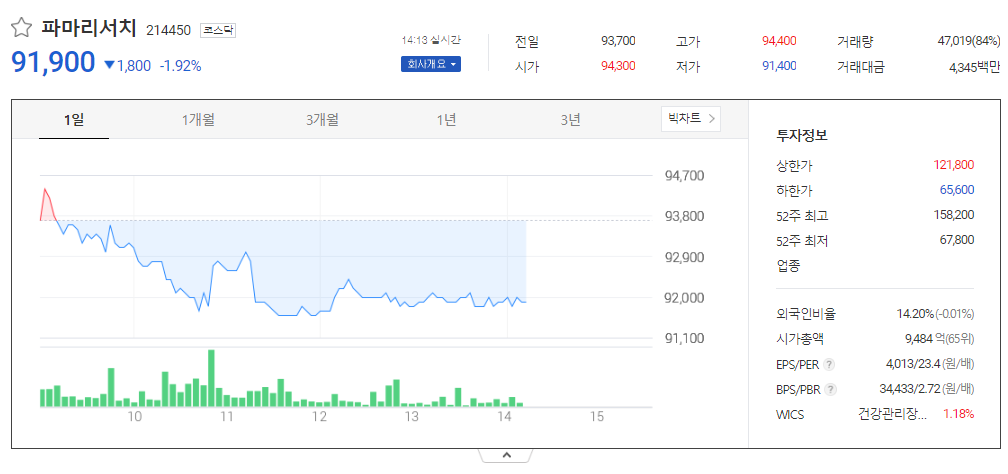 파마리서치 현재 주가는 93,700원이며 전일 대비 -15.74원의 모습을 보이고 있습니다. 파마리서치의 주주현황을 살펴보면 정상수(외 9인)이 지분 38.89%를 소유하고 있습니다. 파마리서치는 의료 장비 및 서비스 기업으로 장중 기준으로 주가는 93,700원 입니다. 파마리서치 시가 총액은 9495억 원이며 발행 주식수는 14.20주 입니다. 외국인 보유 비중은 55,391% 이며 장중 거래량은 10,320,423를 기록했습니다. 매출액은 2,610억 원, 영업이익은 659억 원을 달성했습니다. EPS는 9,210원이며 파마리서치 주식 배당수익률은 0.96% 입니다.