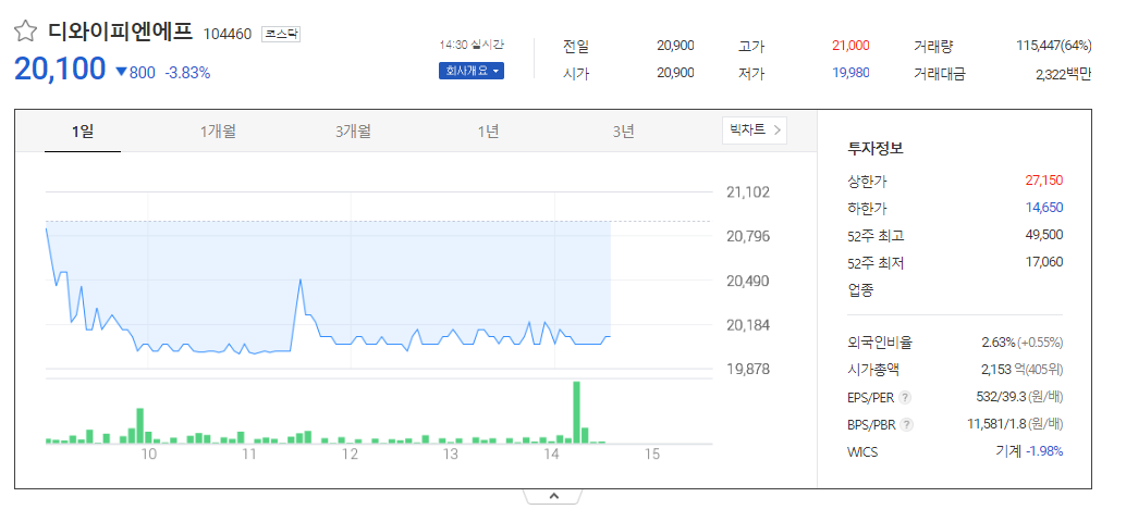 이 글에서는 디와이피엔에프 주가 전망과 목표 주가, 기업 정보에 대해서 설명합니다. 주식 거래에서 중요한 부분은 현재 기업 가치보다는 미래의 기업 가치를 예측하고 먼저 행동하는 것입니다. 투자할 종목을 고르기 전에 현재 기업의 상황과 지표를 살펴보는 것이 중요합니다. 디와이피엔에프 주식의 주요 현황과 투자 정보를 확인하시고 주식 투자에 도움이 될 만한 정보들을 모아 놓았으니 투자를 고려하실 때 참고하세요..