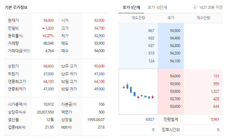 동화기업 현재 주가는 53,500원이며 전일 대비 -700원의 모습을 보이고 있습니다. 동화기업의 주주현황을 살펴보면 DONGWHA INTERNATIONAL CO.,LTD(외 12인)이 지분 70.27%를 소유하고 있습니다. 동화기업는 건축자재 기업으로 장중 기준으로 주가는 53,500원 입니다. 삼성전자의 시가 총액은 1조670억 원이며 발행 주식수는 42.70주 입니다. 외국인 보유 비중은 78,149% 이며 장중 거래량은 20,207,553를 기록했습니다. 매출액은 11,004억 원, 영업이익은 1,049억 원을 달성했습니다. EPS는 601원이며 동화기업 주식 배당수익률은 0.73% 입니다.