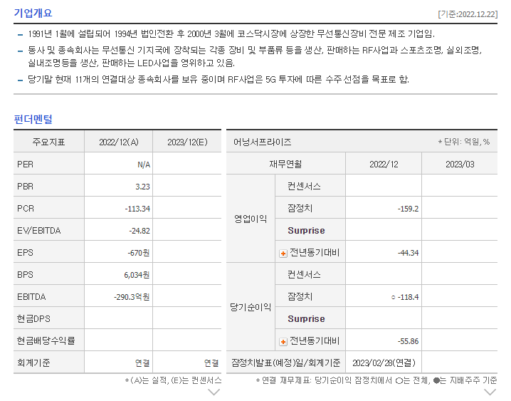 -1991년 1월에 설립되어 1994년 법인전환 후 2000년 3월에 코스닥시장에 상장한 무선통신장비 전문 제조 기업임. 동사 및 종속회사는 무선통신 기지국에 장착되는 각종 장비 및 부품류 등을 생산, 판매하는 RF사업과 스포츠조명, 실외조명, 실내조명등을 생산, 판매하는 LED사업을 영위하고 있음. 당기말 현재 11개의 연결대상 종속회사를 보유 중이며 RF사업은 5G 투자에 따른 수주 선점을 목표로 함.