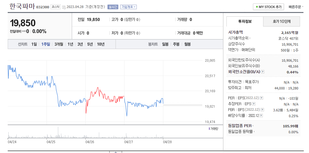 한국파마 현재 주가는 19,850원이며 전일 대비 -9.48원의 모습을 보이고 있습니다. 한국파마의 주주현황을 살펴보면 박재돈(외 17인)이 지분 65.29%를 소유하고 있습니다. 한국파마는 제약 기업으로 장중 기준으로 주가는 19,850원 입니다. 삼성전자의 시가 총액은 2173억 원이며 발행 주식수는 0.45주 입니다. 외국인 보유 비중은 19,243% 이며 장중 거래량은 10,906,701를 기록했습니다. 매출액은 810억 원, 영업이익은 50억 원을 달성했습니다. EPS는 없음원이며 한국파마 주식 배당수익률은 0.65% 입니다.
