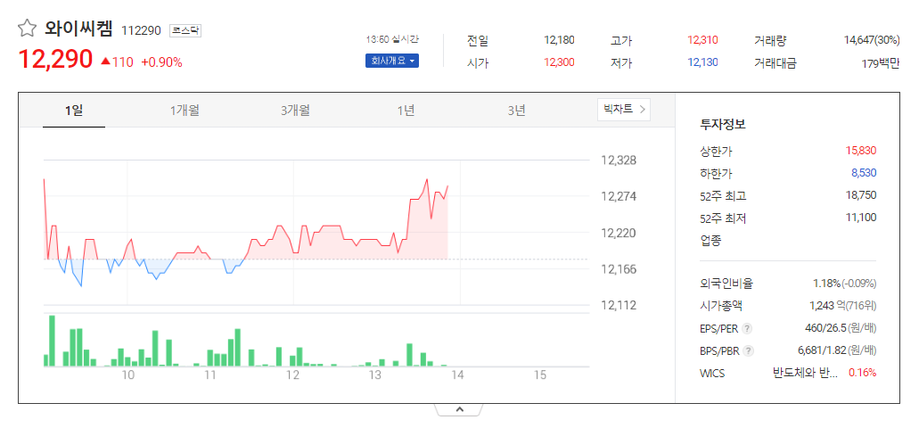 이 글에서는 와이씨켐 주가 전망과 목표 주가, 기업 정보에 대해서 설명합니다. 주식 투자에 앞서 정확한 기업 정보와 주가 현황에 대해 정리해보는 것은 아주 중요합니다. 와이씨켐 주식의 주요 현황과 투자 정보를 확인하시고 현재 시장에서의 흐름을 파악해 보겠습니다.
