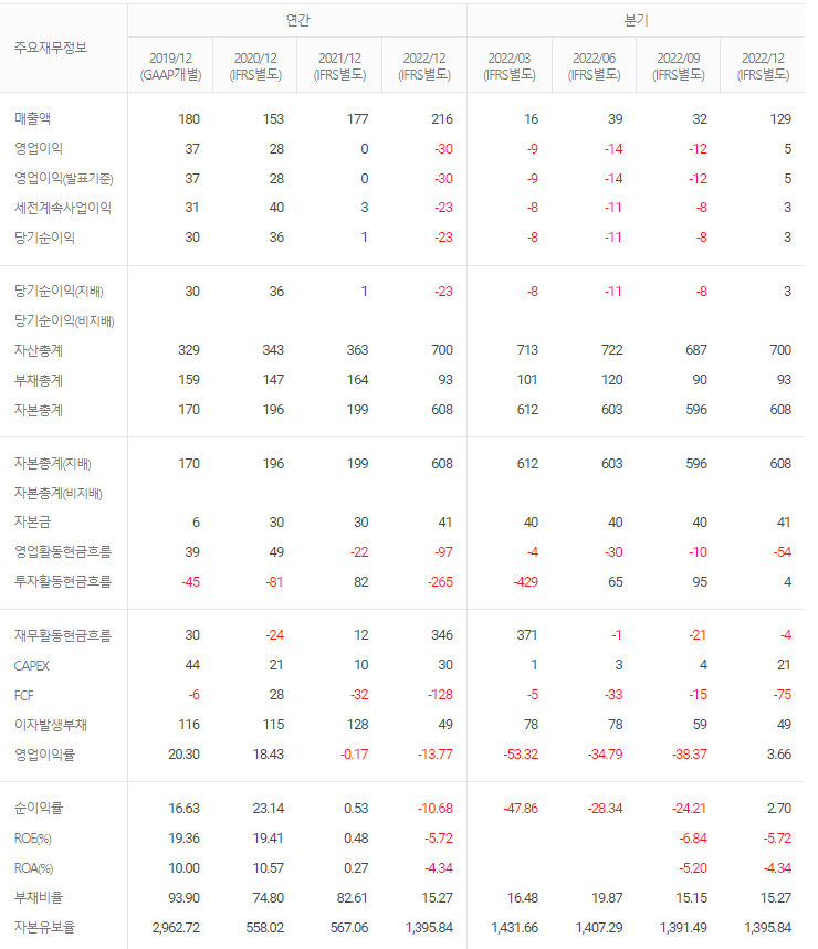 -2022년 12월 전년동기 대비 별도기준 매출액은 21.8% 증가, 영업손실은 9816.7% 증가, 당기순이익 적자전환. 유동비율(당기 865.29%, 전기 165.55%)은 전기 대비 699.74%p 증가. 차입금의존도는 감소. 유동성 변동 주요 사유는 2022년 2월 코스탁시장 상장에 따른 유상증자로 인한 자금유입. 동사는 2016년 이후 연구개발비 지속적으로 투입해오고 있음. 2022년 매출액 대비 연구개발비는 19.11%.